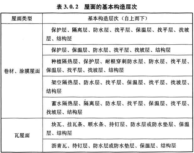 3.0.2 屋面的基本构造层次宜符合表3.0.2的要求。设计人员可根据建筑物的性质、使用功能、气候条件等因素进行组合。